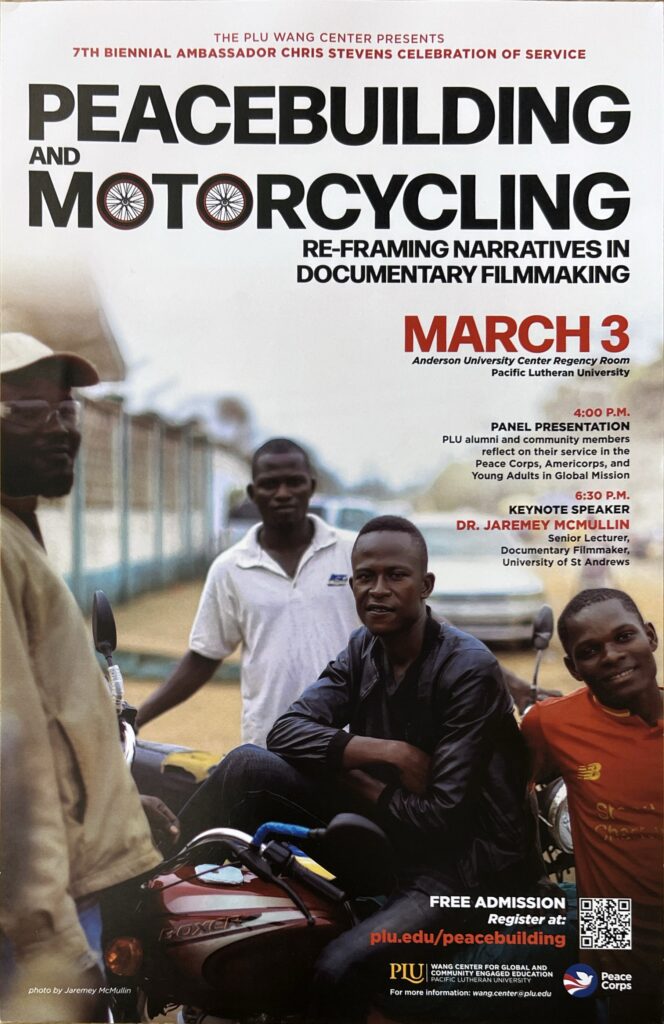 Dr Jaremey McMullin, Senior Lecturer in International Relations and Director of CPCS, delivered the keynote presentation for the 7th Biennial Ambassador Chris Stevens Celebration of Service at Pacific Lutheran University in Tacoma, Washington on 3 March 2025. His address, ‘Peacebuilding and Motorcycling: Re-Framing Narratives in Documentary Filmmaking,’ can be viewed here, beginning at the 02:54:20 mark. As part of the daylong event, Dr. McMullin also convened a workshop on peacebuilding and mediation for PLU students, faculty, and staff, drawing on his cross-border dialogue project in the Mano River Basin in West Africa to discuss its broader applications as a peacebuilding strategy in local US community contexts.